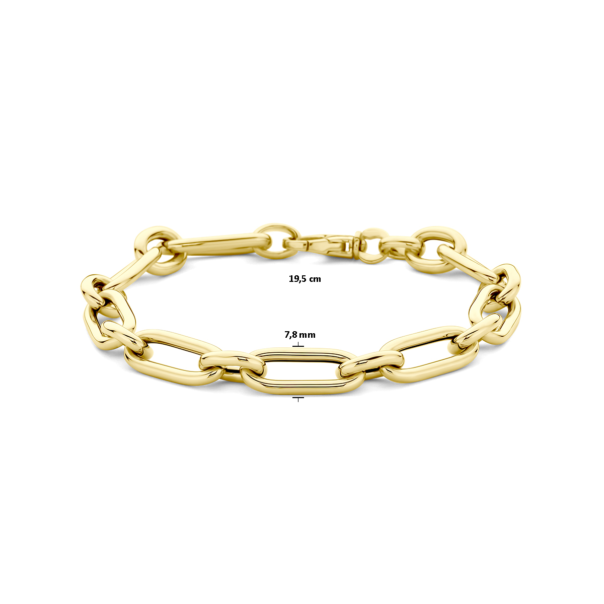 14k Geelgouden armband met een draaglengte van 19.5cm. De schakelbreedte is 7.8mm. Uitgevoerd met een karabijn sluiting.