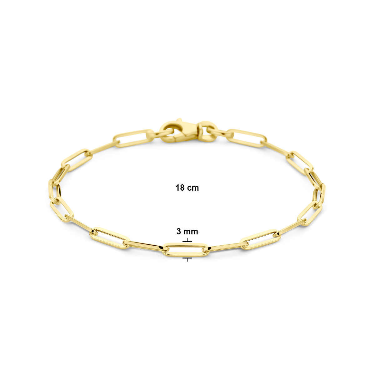 14k Geelgouden paperclip armband met een schakelbreedte van 3mm. De armband is uitgevoerd met een stevige karabijn sluiting en heeft een draaglengte van 18cm.