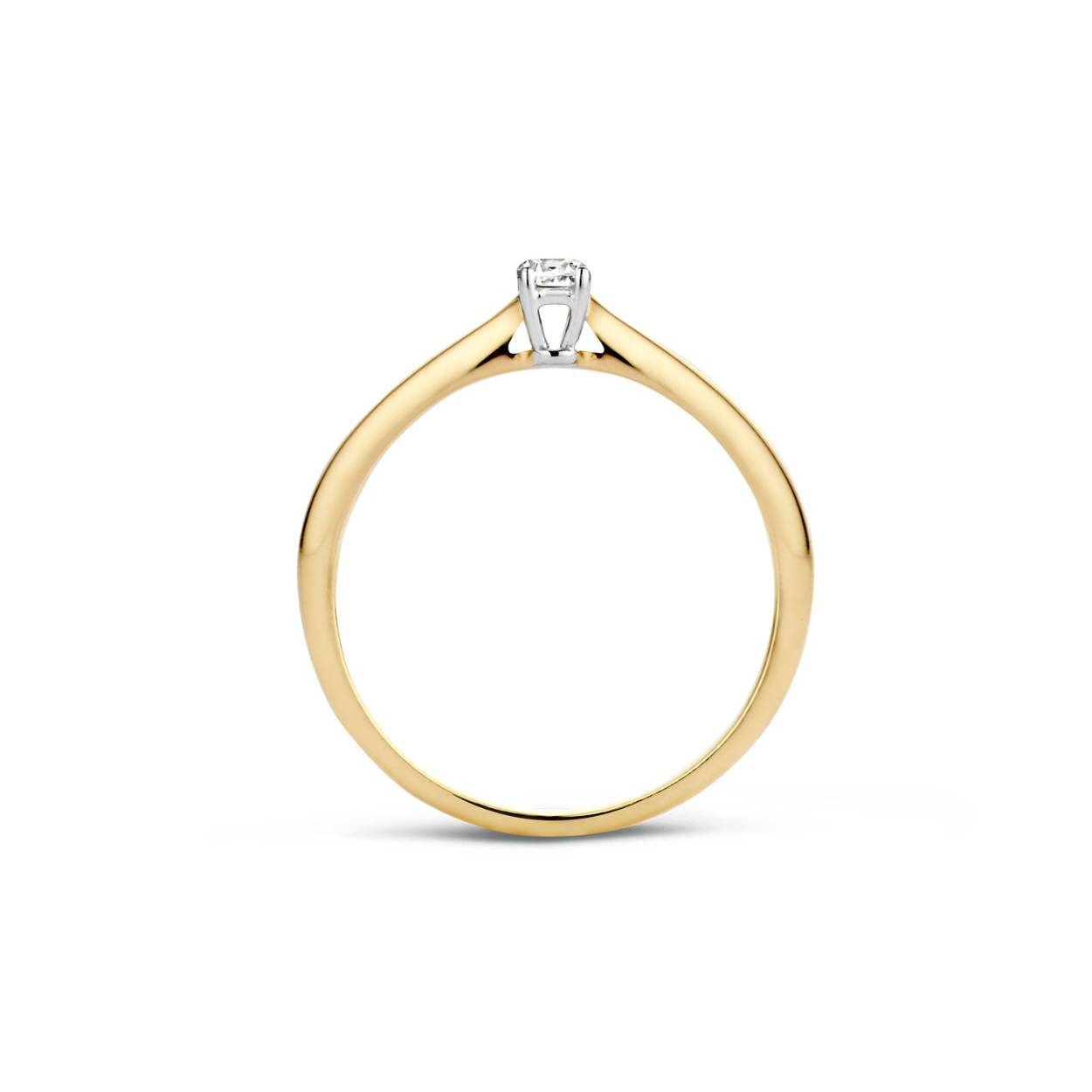 Een zirkonia in chatonzetting siert deze elegante ring van 14k wit -en geelgoud. De band is 1,8 mm breed en de steen heeft een doorsnede van 3 mm. Leuk om te mixen en matchen met andere ringen uit onze collectie.