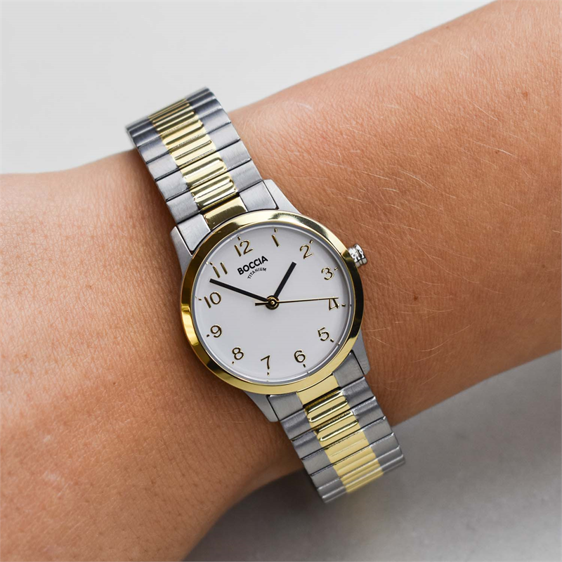 Dit dameshorloge van Boccia Titanium heeft een nette uitstraling. De bi-color titanium horlogekast zorgt voor een stijlvolle look en de witte wijzerplaat maakt het horloge klassiek. Het horloge heeft een ronde kast met een diameter van 26mm, een mineraalglas, en is 5ATM. Combineer dit prachtige exemplaar met de andere sieraden van Boccia Titanium voor een complete look. Aan de titanium kast zit een bi-color schakel band.