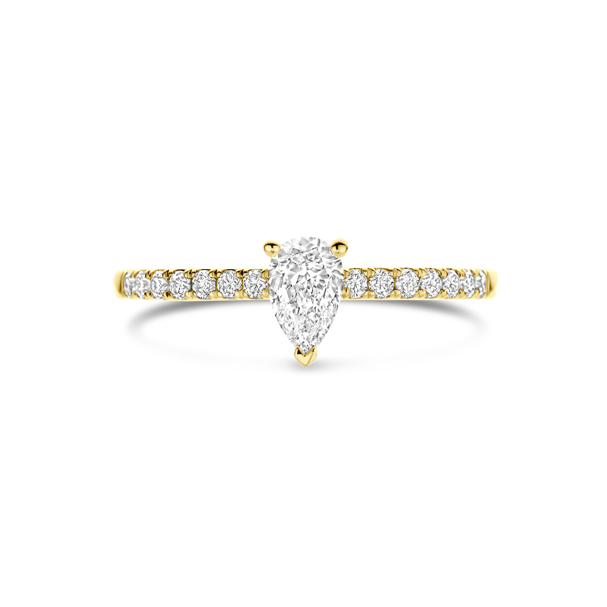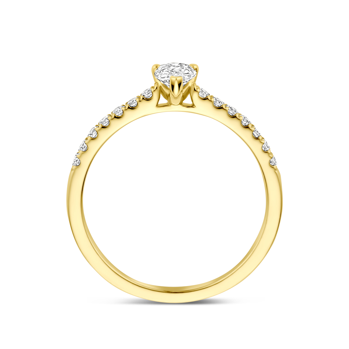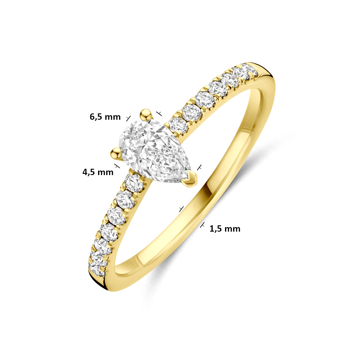 14k Geelgouden ring uitgevoerd met lab grown diamant. De steen heeft een afmeting van 6,5x4,5mm. Het totale diamantgewicht is 0.58ct. Lab grown diamanten zijn diamanten die ontstaan in een laboratorium. Onder extreem hoge druk en temperatuur wordt het natuurlijk ontstaansproces nagebootst met als eindresultaat een diamant met dezelfde chemische eigenschappen maar met een andere oorsprong.