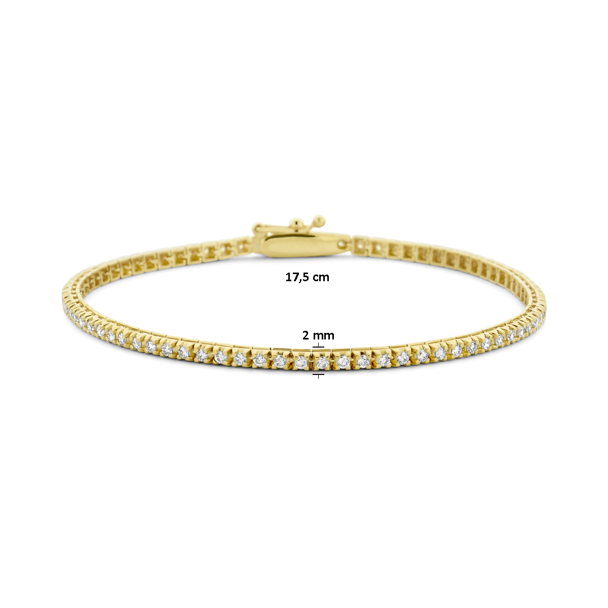 14k Geelgouden tennisarmband uitgevoerd met schitterende lab grown diamanten. De tennisarmband heeft een draaglengte van 17.5cm en een schakelbreedte van 2mm. Het diamantgewicht is 1.00ct. Lab grown diamanten zijn diamanten die ontstaan in een laboratorium. Onder extreem hoge druk en temperatuur wordt het natuurlijk ontstaansproces nagebootst met als eindresultaat een diamant met dezelfde chemische eigenschappen maar met een andere oorsprong.