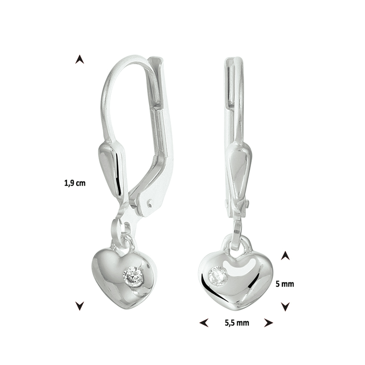 Gerhodineerd zilveren oorhangers uitgevoerd met een hartje van 5x5.5mm en een heldere zirkonia. Tip: Leuk om kado te geven! Zie je ze al stralen? Info: Gerhodineerd zilver is door de rhodiumlaag beter bestand tegen verkleuren en krassen.