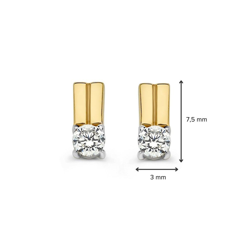 Bicolor wit- en geelgouden oorstekers met zirkonia in strak design.