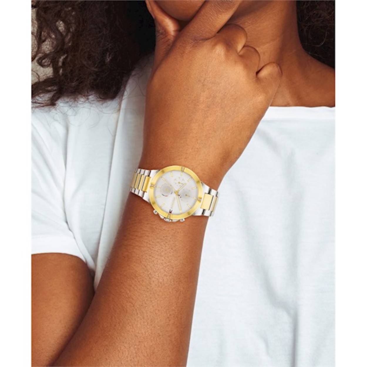 Tommy Hilfiger horloge Talia.  Dit Bicolour Tommy Hilfiger horloge is sportief met een attitude. De steentjes in de horlogekast geven een elegante draai aan deze sportieve stijl. De horlogeband is zowel zilver- als goudkleurig en met zijn multifunctionele wijzerplaat is dit horloge een absolute must en maakt iedere look compleet!