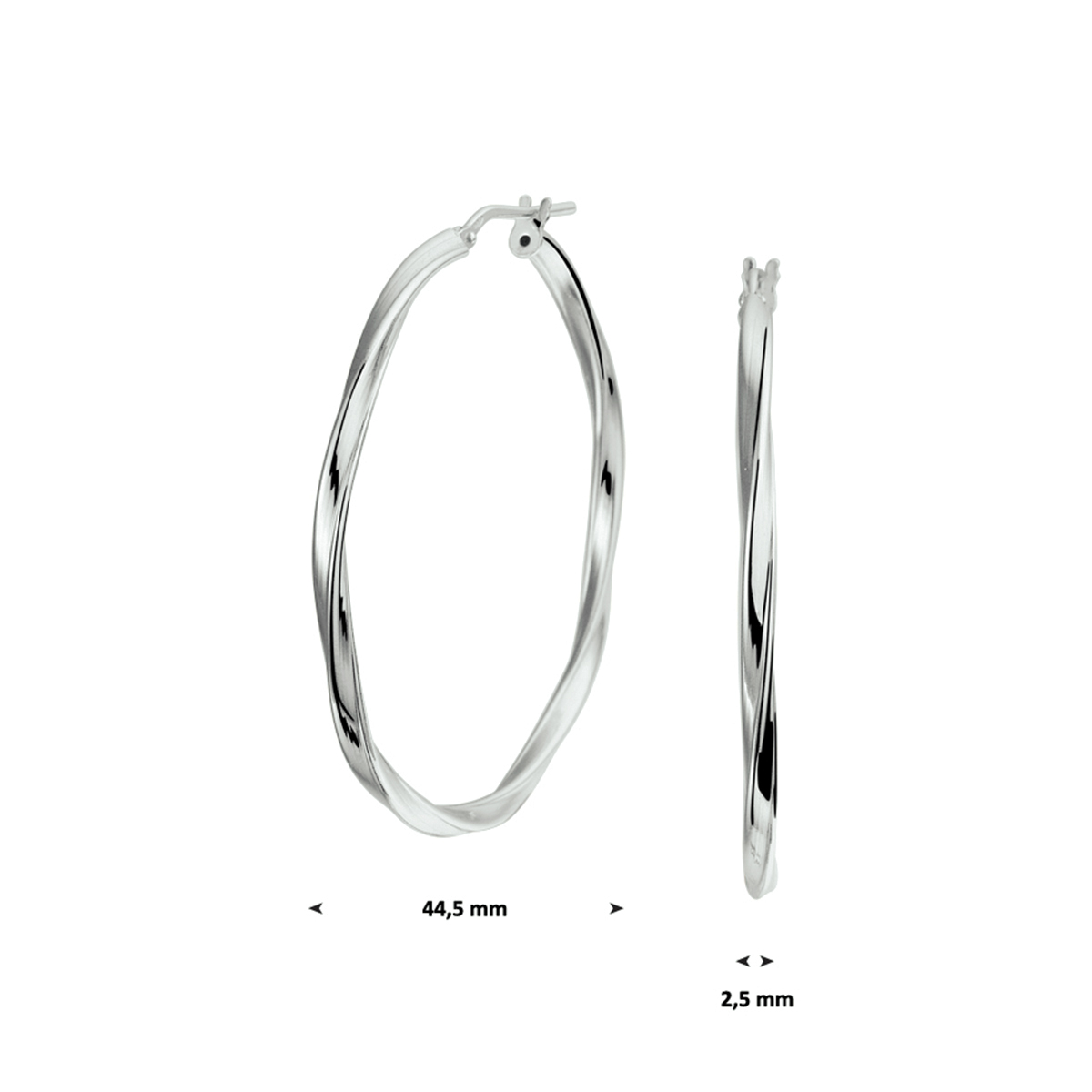 Gerhodineerd zilveren oorringen met een afmeting van 44.5x2.5mm uitgevoerd met een gedraaide buis en stevige scharnier sluiting.